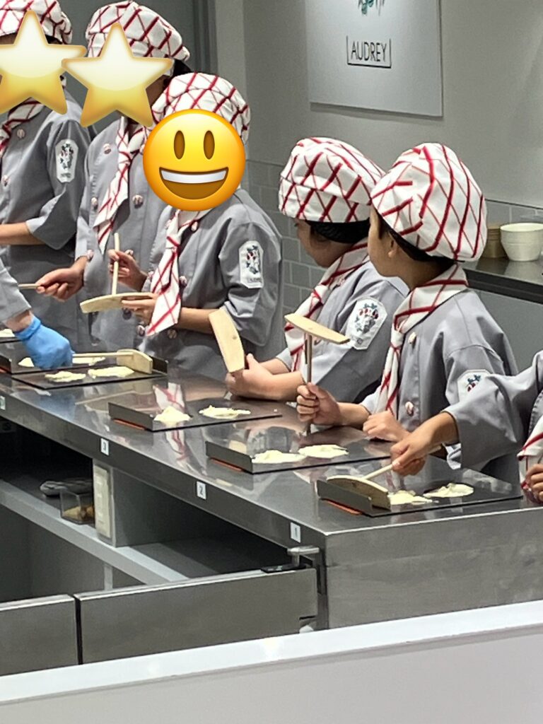 しかし、体験が始まると真剣な顔でスタッフさんの説明をよく聞き、クレープのような形のクッキーを一生懸命作っていました。
